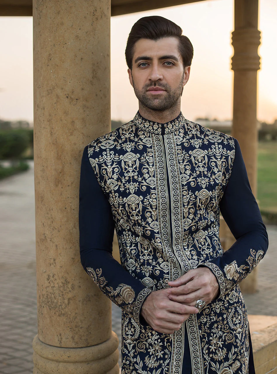 Make a grand entrance in this navy blue sherwani accentuated with intricate embroidered floral and baroque patterns on front and sleeves.