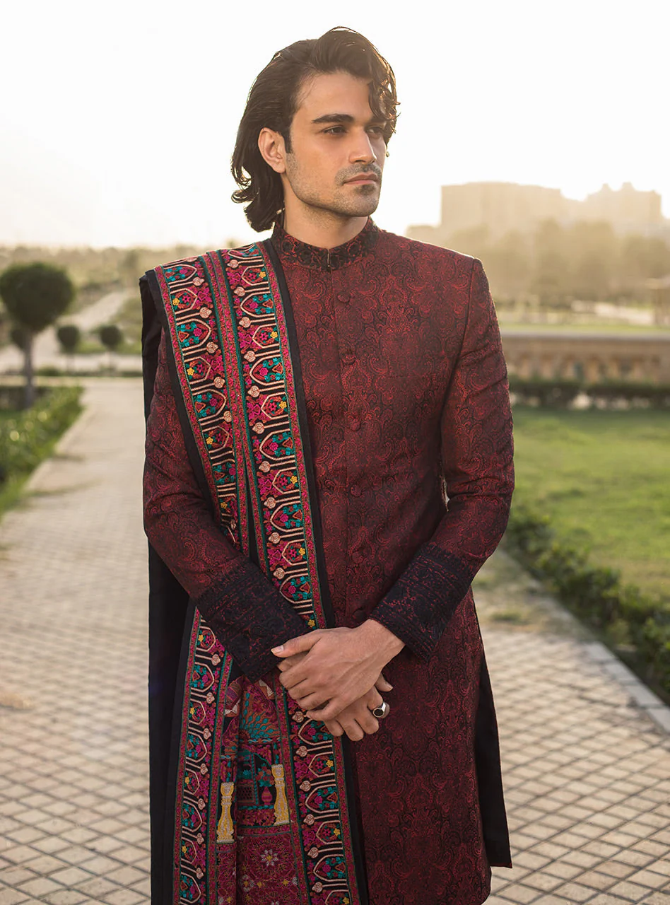 A richly detailed sherwani on red jacquard canvas with black embroidered collar and sleeves border is a perfect mélange to draws everyone’s attention.