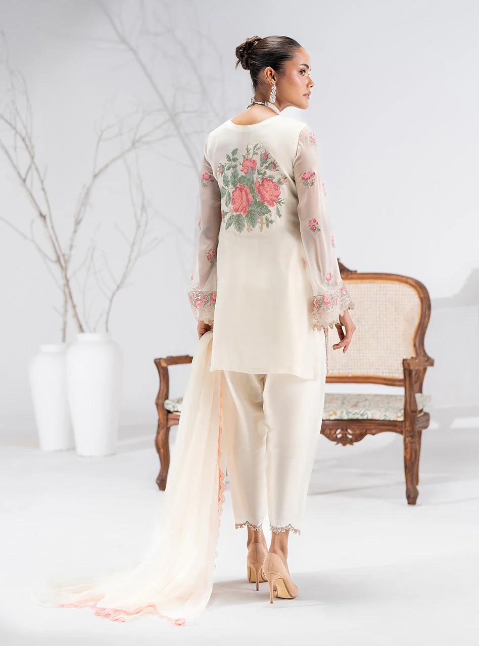 The beautiful ivory, flowy chiffon feels incredible to wear, light and elegant. This version features a chic, short shirt silhouette that feels modern and fresh, while still showcasing the exquisite delicate floral embroidery that blooms across the fabric and those lovely flared sleeves. Complete with its beautifully detailed dupatta and perfectly matched trousers.