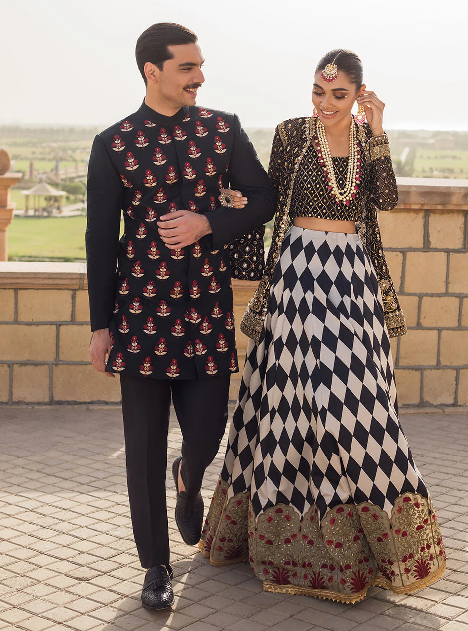 This black sherwani is emphasized with embroidered floral motifs in maroon and beige
