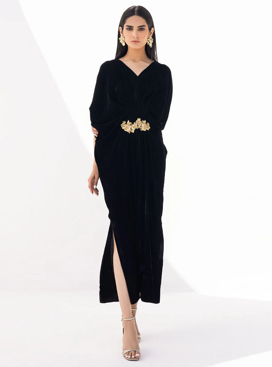 Radiate an appearance in this opulent black velvet kaftan. Intricately hand embellished motif exudes more glamour.