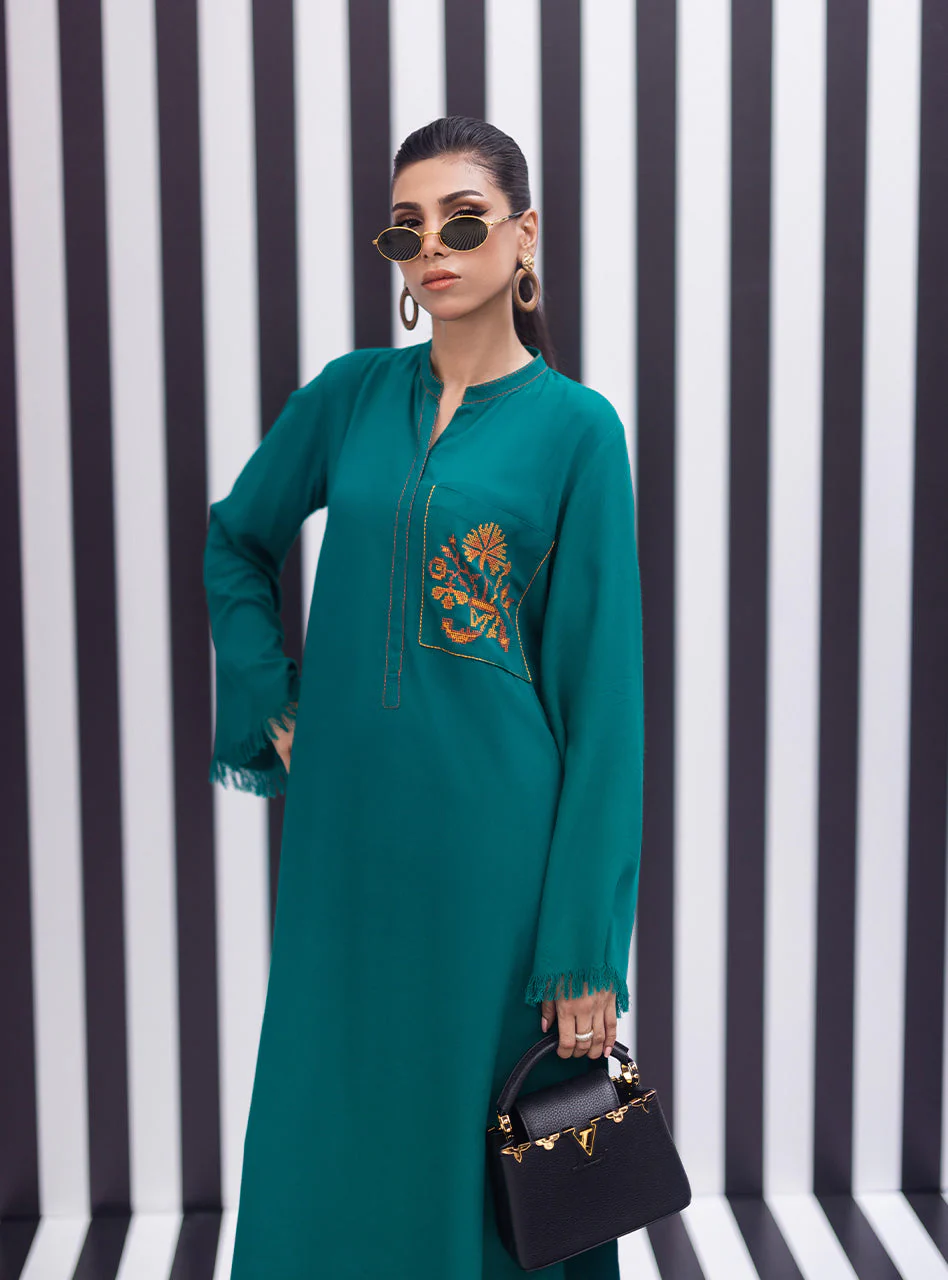 A teal green co-ord set features a long, straight-cut shirt paired with matching culottes. The shirt is adorned with intricate tango colored embroidery on the front pocket, creating a striking contrast against the rich teal fabric, making the ensemble both stylish and unique, offering a comfortable yet chic silhouette perfect for any occasion.