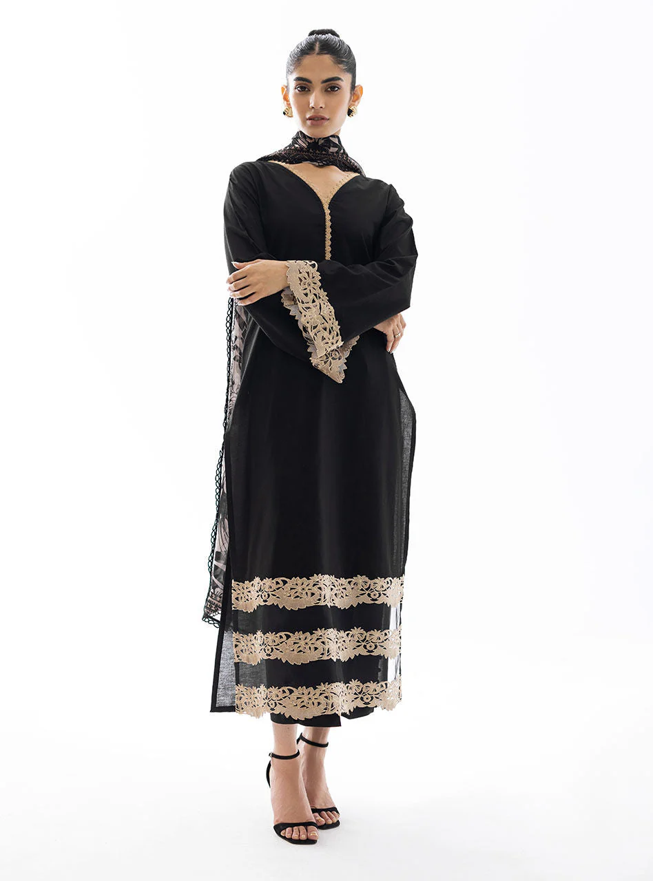 This exquisite co-ord set is adorned with beige daman and sleeves borders. It is paired with printed dupatta, adding a touch of elegance to your everyday attire.