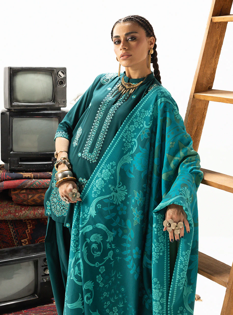 Kyana is a statement of unparalleled depth and luxury, captured entirely in the most mesmerizing jewel tones. The flowing Marina Twill ensemble is drenched in a profound emerald green, providing the ideal backdrop for intricate, tonal embroidery in teal and lighter jade hues. The complex motifs cascade across the suit and onto the matching Lenzing Ecovero dupatta, creating a seamless, ethereal silhouette that trails elegantly. This monochromatic masterpiece emphasizes artisanal craftsmanship and regal grace.