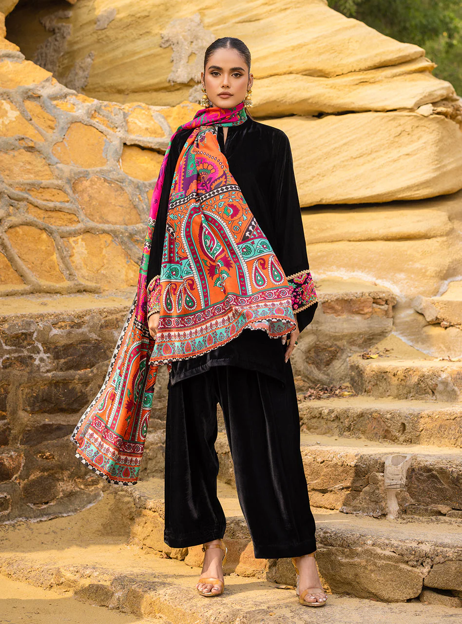 Step into a realm of velvet elegance with this outfit which features a straight velvet shirt with threadwork on the sleeves and a meticulous digital print dupatta.