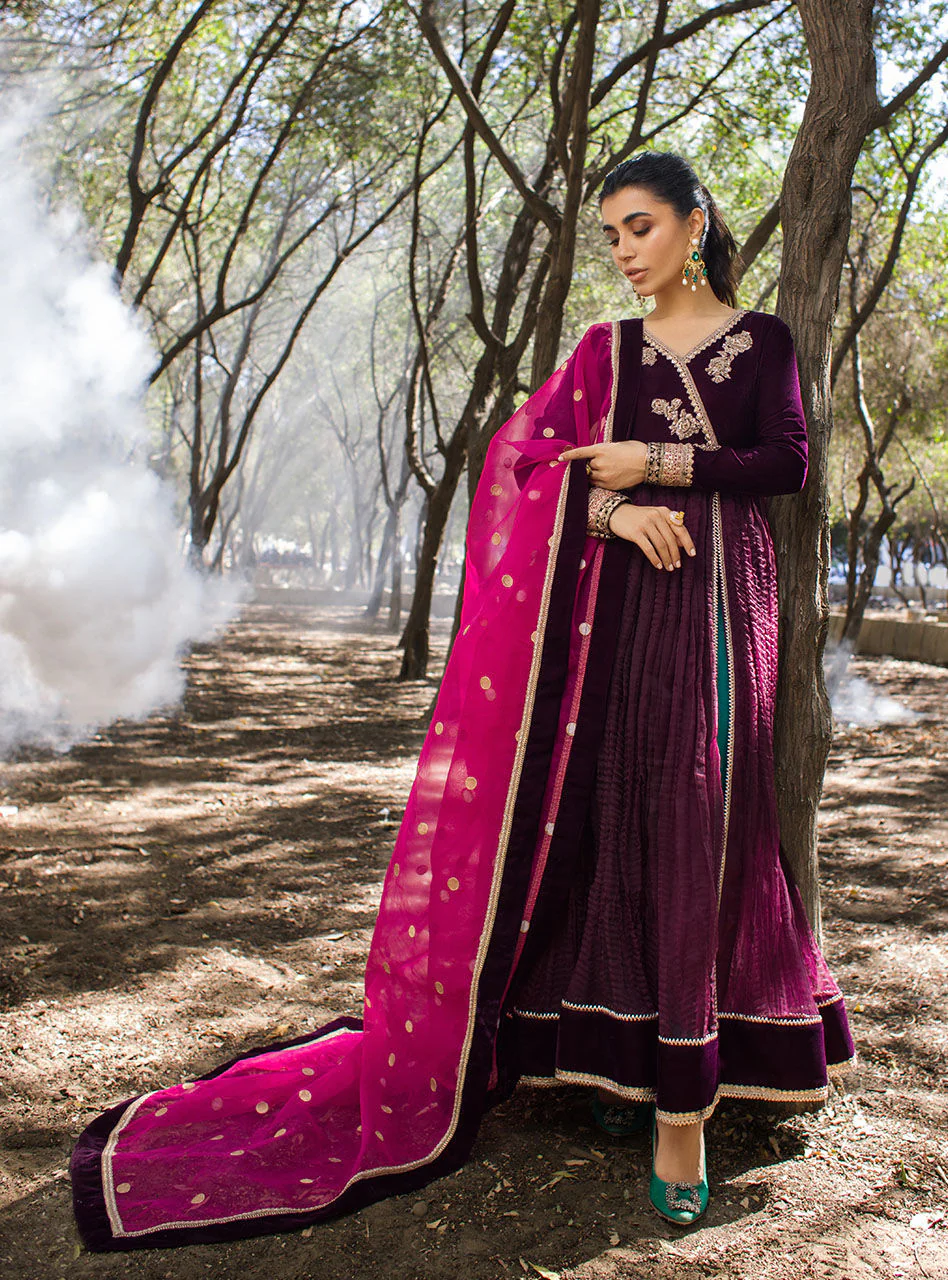 Evoke an exquisite presence in this plum crushed velvet anarkali style attire decorated with embellished motifs and borders on the bodice. It comes with the perfect contrasting shade of emerald green pants allured with a floral border on hemline .Paired with a hot pink dupatta adorned polkadots with velvet edging finishes the look for any event.