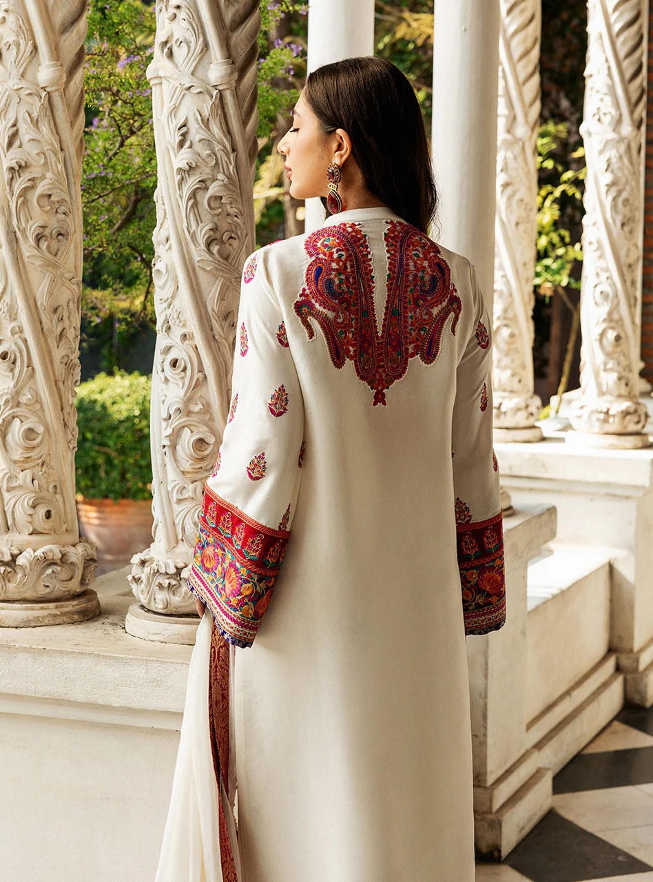 The ethereal white shirt is adorned with a playful floral pattern with Kashmiri embroidery, reminiscent of ruby-red blooms dancing in the breeze. The back of the dress is a stunning showcase of Kashmiri artistry. A vibrant tapestry of hand-embroidered motifs in rich colors adorns the back. The look is completed with a pair of plain raw silk pants & a pure chiffon dupatta, finished with a delicate jamawar border, adding a touch of ethereal charm.
