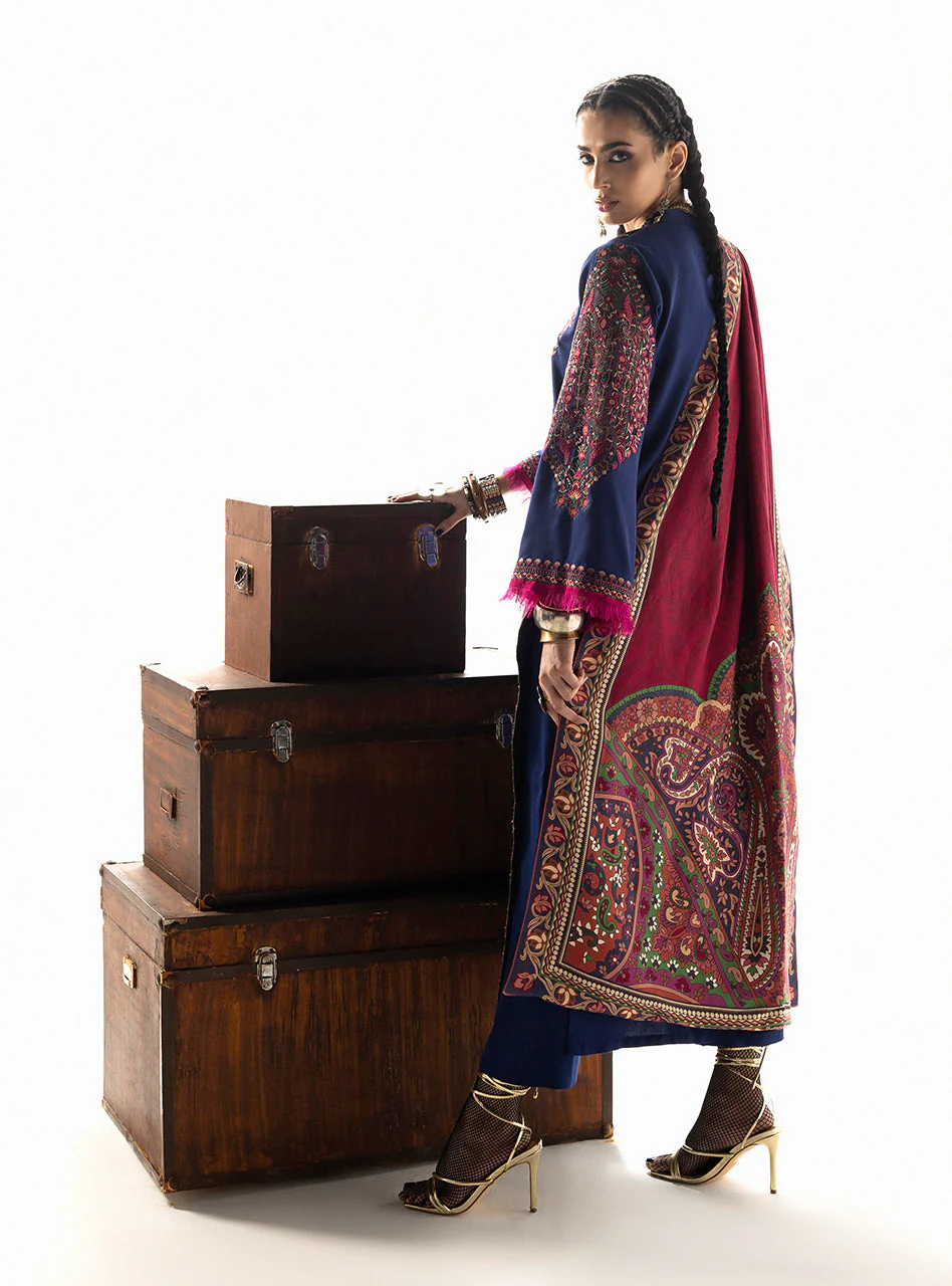 Vilana stands as the crowning jewel of the collection, a magnificent study in rich, contrasting heritage colors. The deep indigo-navy Marina Twill suit provides a sophisticated, midnight canvas, beautifully illuminated by the dramatic accents of fuchsia and elaborate embroidery. The focal point is the exquisite Lenzing Ecovero dupatta, which is a tapestry of complex paisley patterns in tones of deep crimson, plum, and olive, providing unparalleled depth and luxury.